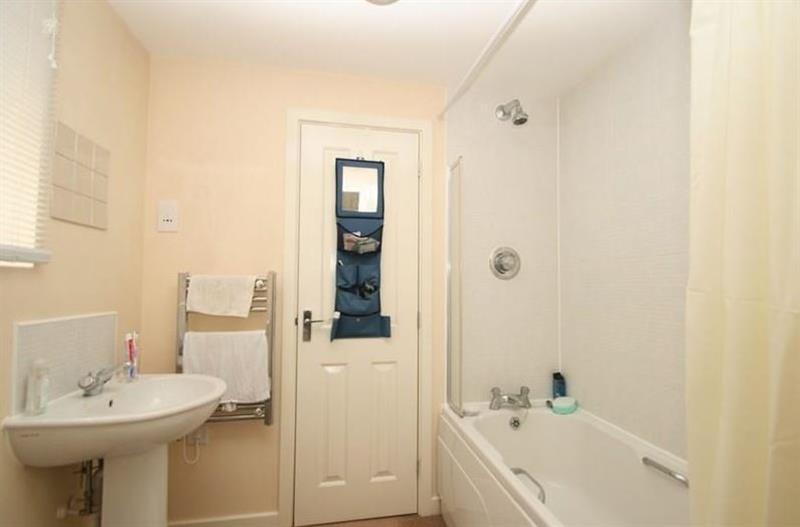 Bathroom: enclosed bath with fitted wall shower, part tiled walls, low level w.c., pedestal wash basin, heated towel rail, upvc double glazed window with obscured glass to front, airing cupboard