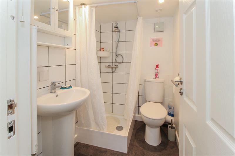 SHOWER ROOM Suite comprising tiled shower cubicle, pedestal wash hand basin, low level w.c., partially tiled walls, extractor