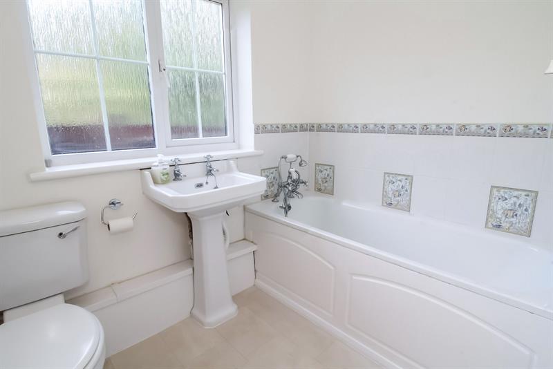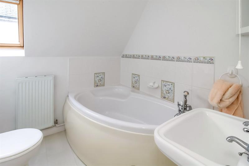 BATHROOM Velux window to side, skilling ceiling, suite comprising corner bath, pedestal wash hand basin, low level w.c., partially tiled walls, radiator.