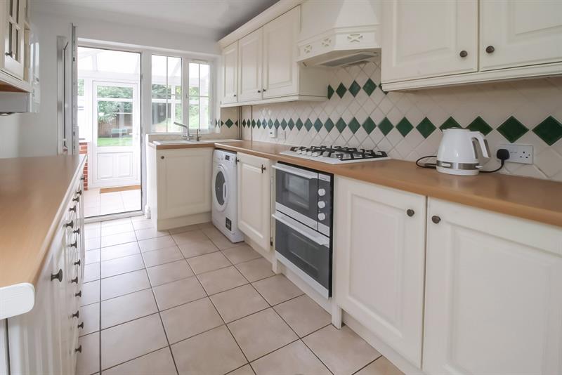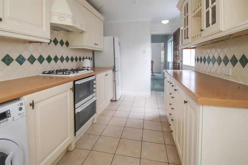 KITCHEN Double glazed windows to side and rear, fitted with a range of wall and base units with work surfaces over, one and a half bowl sink unit with cupboard below, partially tiled walls, built in electric oven