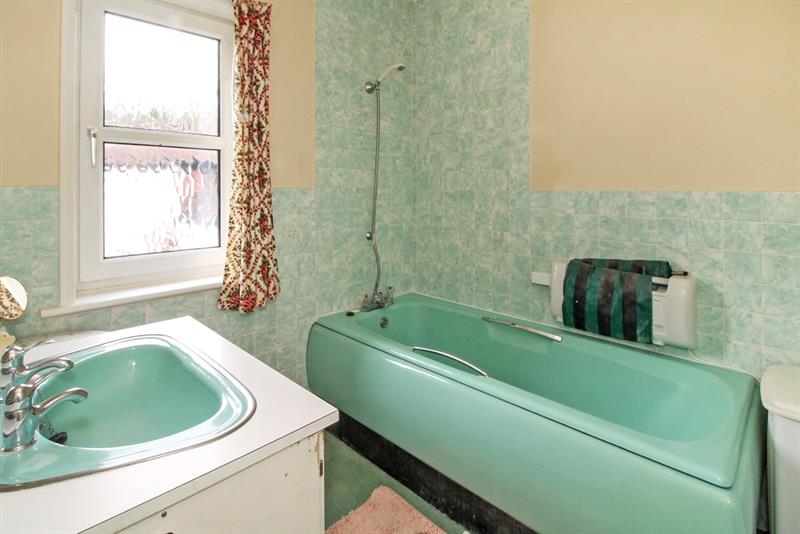 BATHROOM Double glazed window to side, suite comprising panelled bath, wash hand basin with cupboard below, partially tiled walls, radiator.
