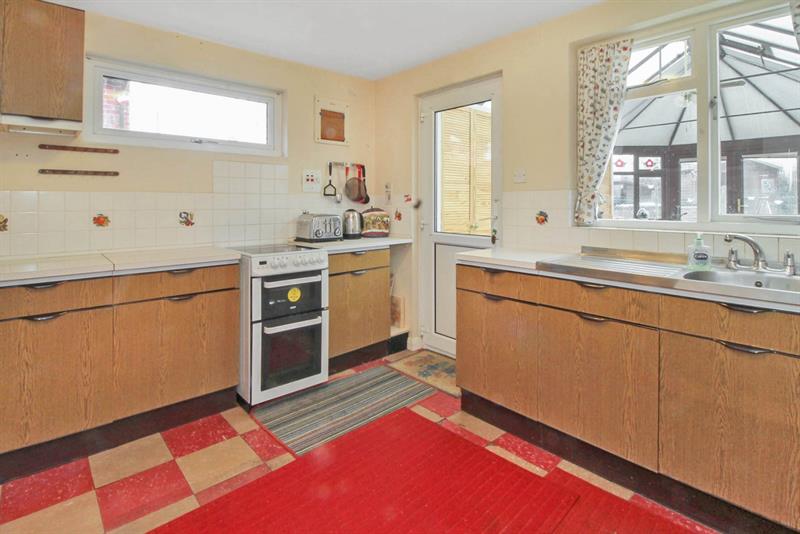 KITCHEN/BREAKFAST ROOM Window to rear, high level double glazed window to side, fitted with a range of wall and base units with work surfaces over, sink unit with cupboard below, partially tiled walls, oven