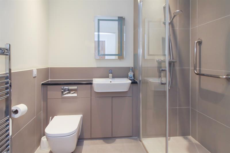 Wet room style suite comprising shower cubicle with glazed screen and drencher head shower, vanity basin with adjacent surface, half tiled walls, low level WC, tiled floor, heated towel rail