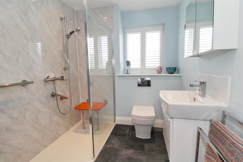 Double glazed window to front, suite comprising of large shower cubicle, low level W.C., wash hand basin with drawer below, cupboard housing gas boiler