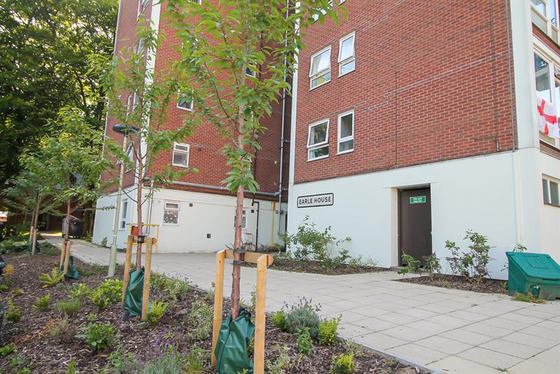 There is a shared parking area outside Earle House and LANDSCAPED GROUNDS