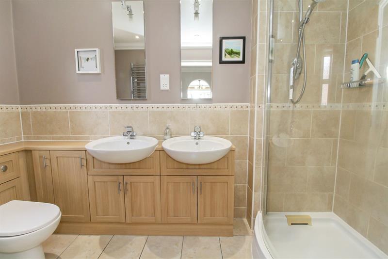 ENSUITE SHOWER ROOM Double glazed window to side, suite comprising tiled shower cubicle, twin wash hand basin with cupboards below, low level w.c., bidet, partially tiled walls, ladder style radiator.