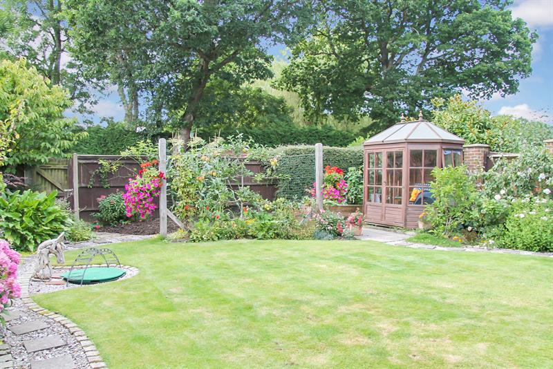 The property is approached via a five bar gate onto a shingled driveway offering parking and leading to the barn style DOUBLE GARAGE 19’2 x 17’11, with twin doors to front. There is access to both sides of property opening onto the attractive enclosed REAR GARDEN with a paved patio area with steps to the lawn, numerous shrubs and borders, summerhouse.