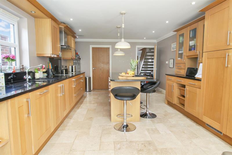KITCHEN/BREAKFAST ROOM Double glazed window to side, fitted with an extensive range of wall and base units with granite work surfaces over, inset one and a half bowl sink unit with cupboard below, central island with granite work surface, cupboards below and integrated refrigerator