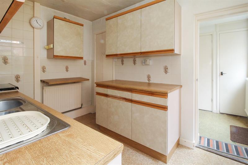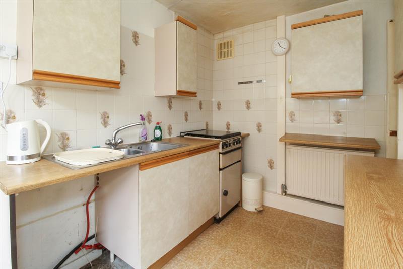 KITCHEN Double glazed window to side, fitted with a range of wall and base units with work surfaces over, one and a half bowl stainless steel sink unit with cupboard below, partially tiled walls, gas cooker point