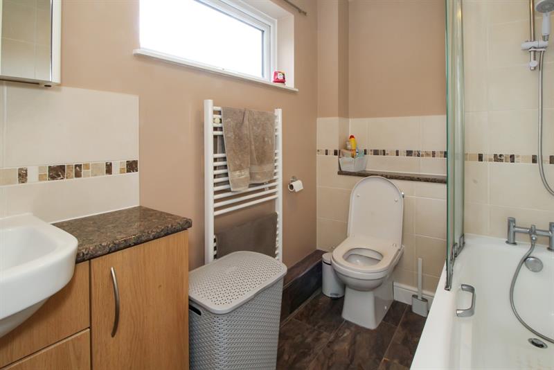 Double glazed window to front, suite comprising panelled bath with shower over, partially tiled walls, low level W.C., wash hand basin with cupboards below, ladder style radiator.