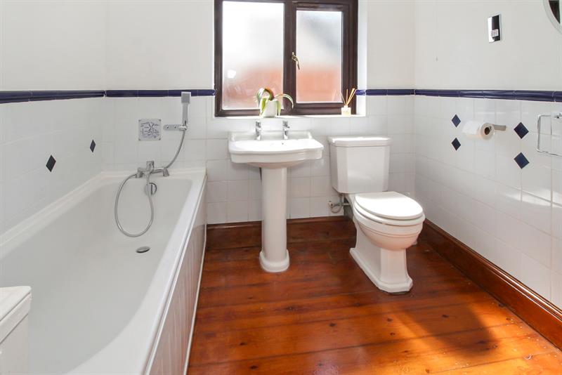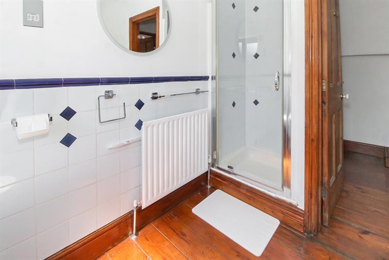 Double glazed window to side, suite comprising of panelled bath, tiled shower cubicle, low level wc., pedestal wash hand basin, half tiled walls, exposed floorboards, radiator.
