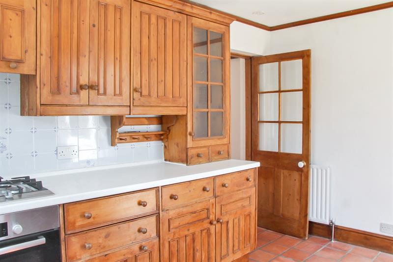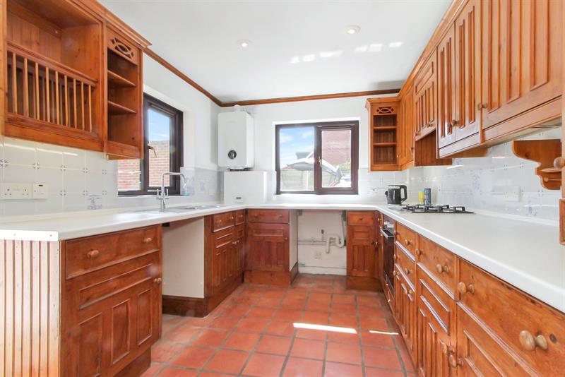Double glazed windows to side and rear overlooking the garden, fitted with a range of wall and base units with work surfaces over, stainless steel sink unit with cupboard below, partially tiled walls, built in electric oven