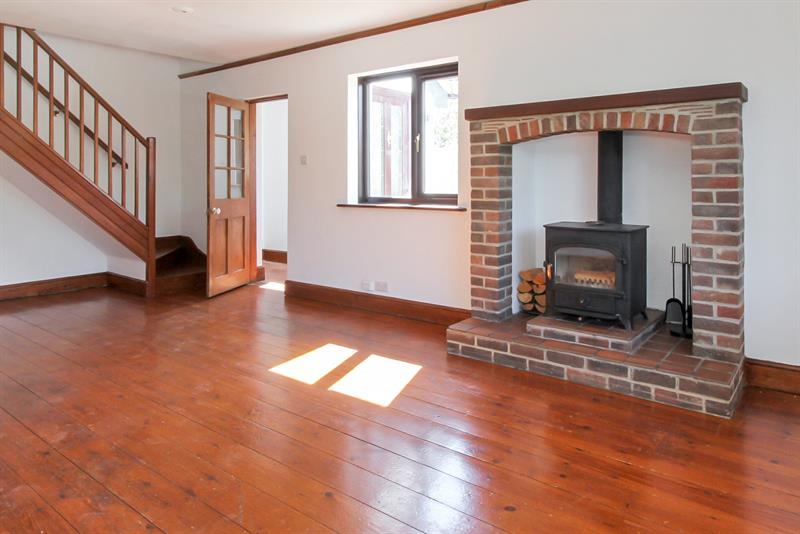 Double glazed bow window to front, double glazed window to side, brick fireplace with quarry tiled hearth and fitted wood burning stove