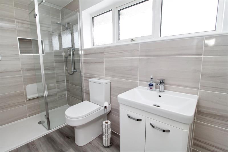 SHOWER ROOM Double glazed window to rear, suite comprising tiled shower cubicle, wash hand basin with cupboard below, low level w.c., partially tiled walls, ladder style radiator.