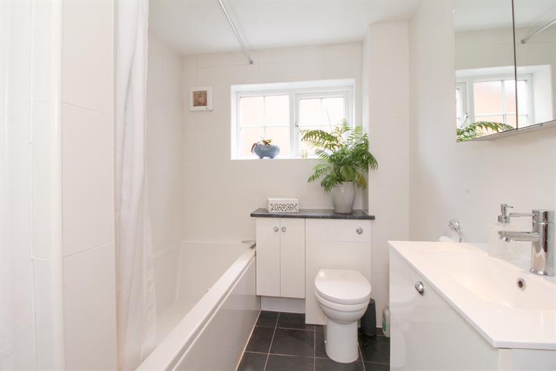 BATHROOM Double glazed window to side, suite comprising panelled bath with shower over, low level w.c., contemporary wash hand basin with drawers below, airing cupboard housing hot water tank, ladder style radiator.