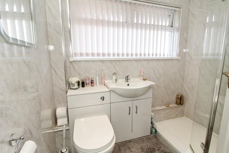 SHOWER ROOM Double glazed window to side, suite comprising shower cubicle with glazed panel, low level w.c., wash hand basin with adjacent surfaces and cupboard below, ladder style radiator.