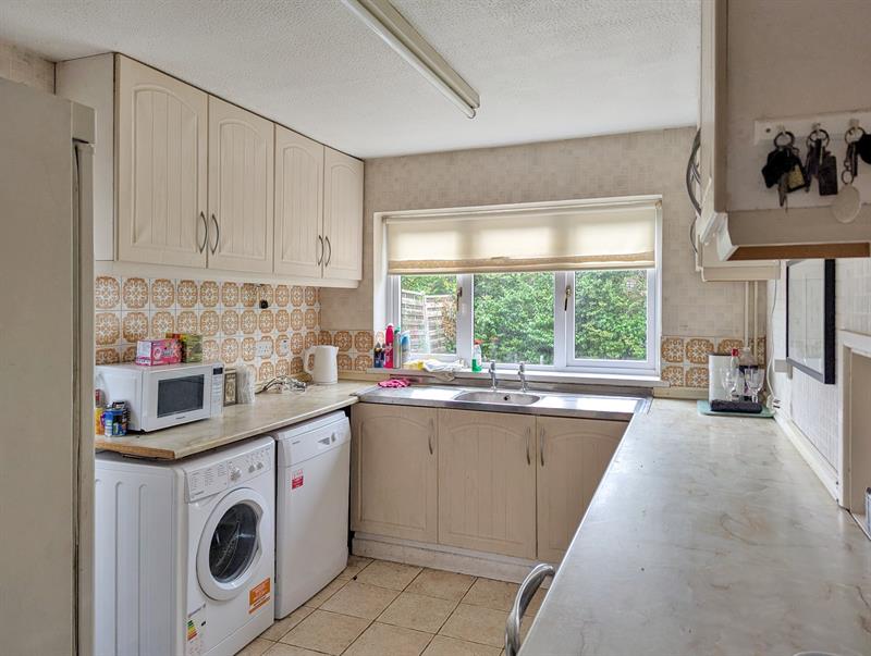 KITCHEN Double glazed windows to rear, fitted with a range of wall and base units with work surfaces over, stainless steel sink unit with cupboard below, partially tiled walls, plumbing for washing machine/dishwasher, double glazed door to side.