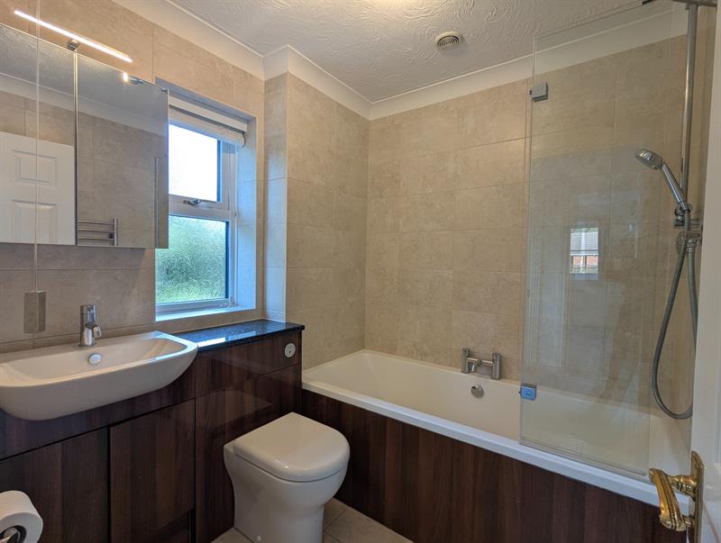 Family bathroom with shower over bath, WC and hand basin with cupboards below