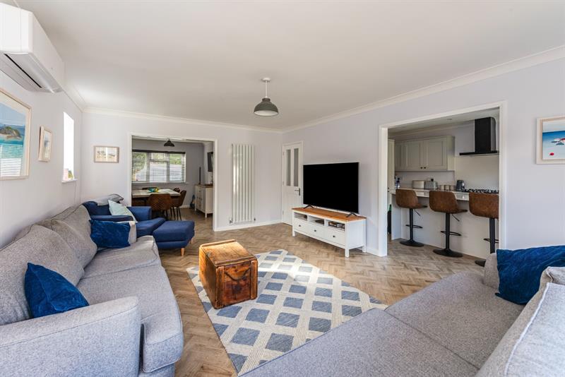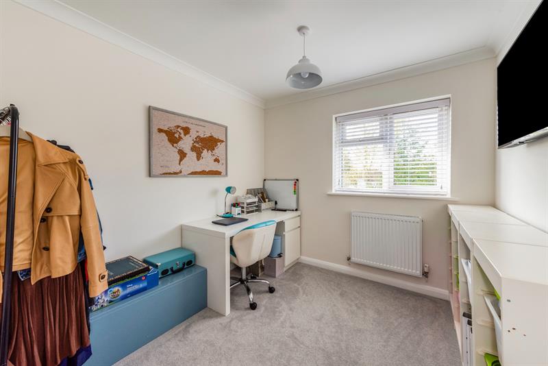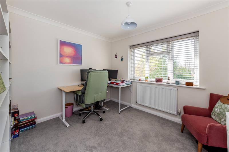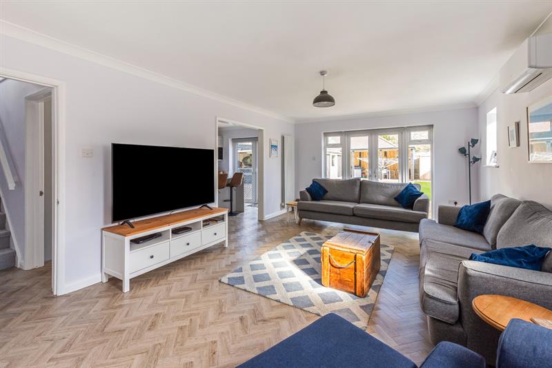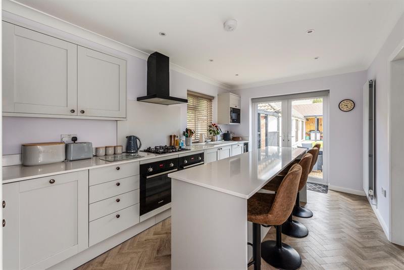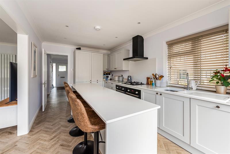 The property has three reception rooms currently being used as a study, dining room and living room with glass doors leading out to the rear garden. The kitchen, which has integrated appliances, has a central island with seating around it, ideal for when entertaining. There is also a separate utility room and downstairs cloakroom.