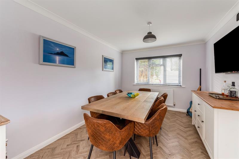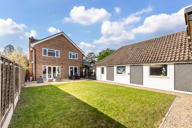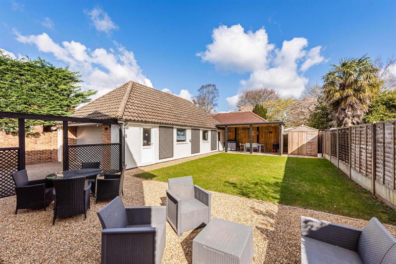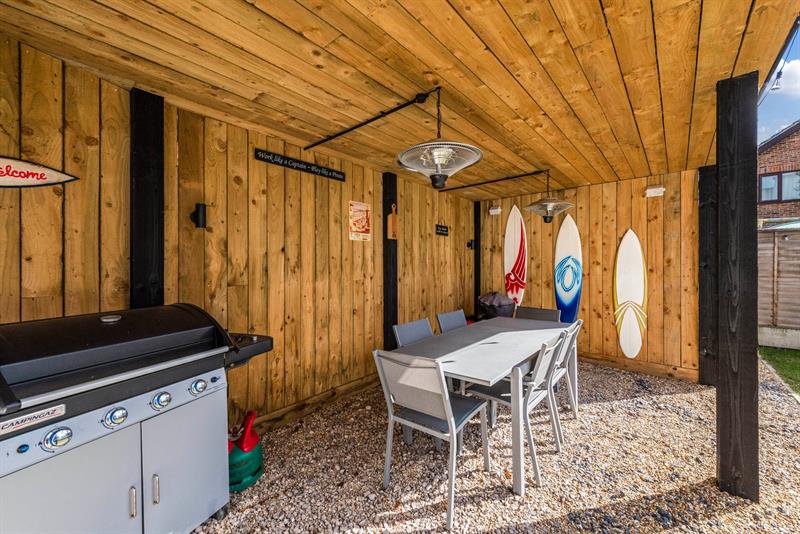 The rear garden is mainly laid to lawn, and at the far end of the garden, is a covered area perfect for outdoor dining.